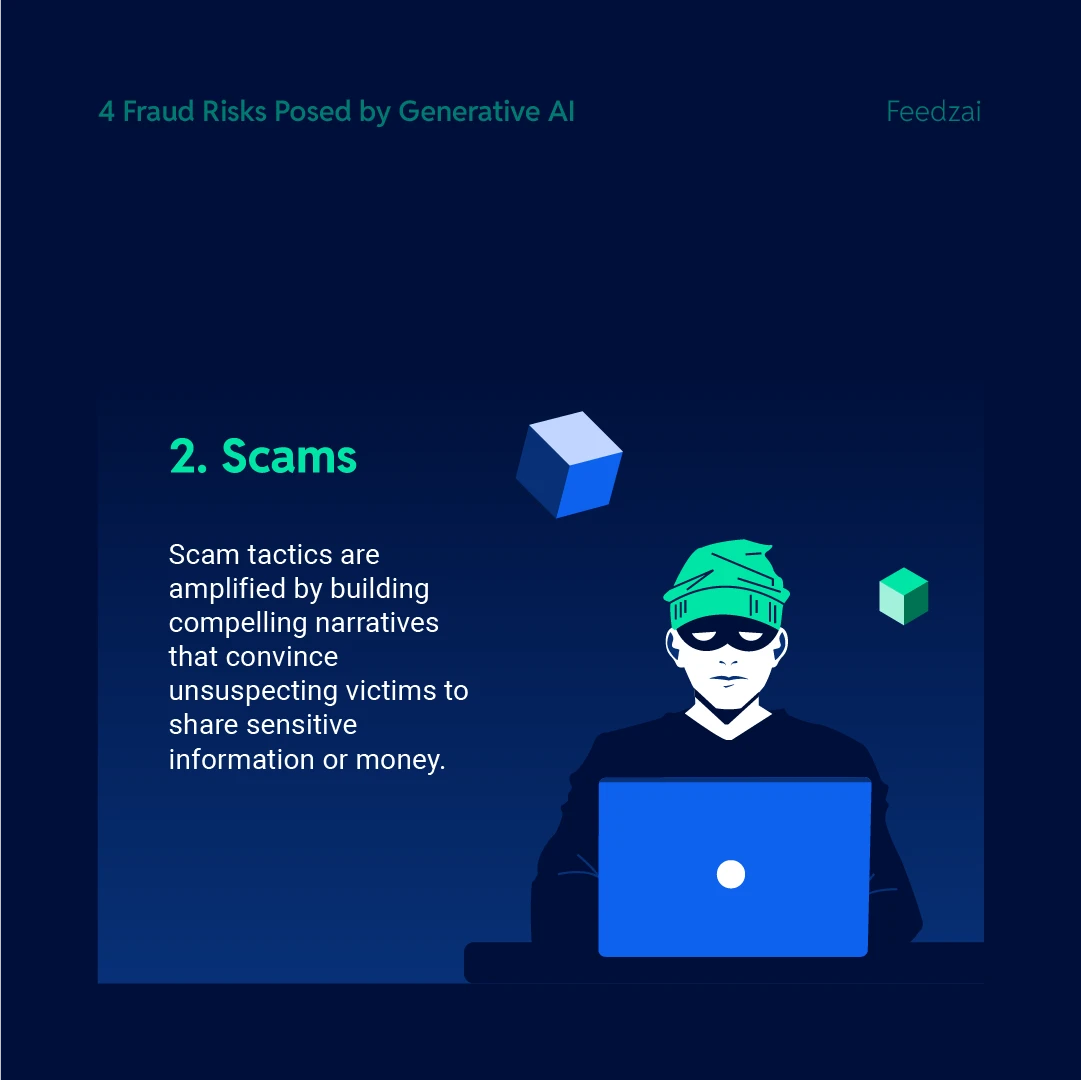 With these realistic-looking or sounding materials, criminals can launch sophisticated attacks like synthetic identity fraud, imposter fraud, or romance scams at scale. They can also create convincing document forgeries and synthetic data to sidestep security controls.