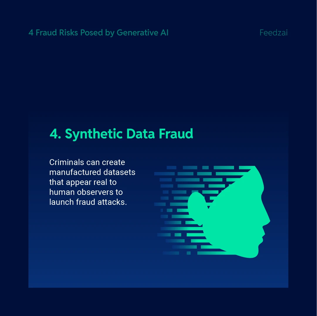 - Synthetic Transaction Data Creation: Criminals can use GenAI to create fabricated transaction activity. Using this data, they can test evasion techniques against anti-fraud systems to understand how to avoid detection by fraud prevention controls.
