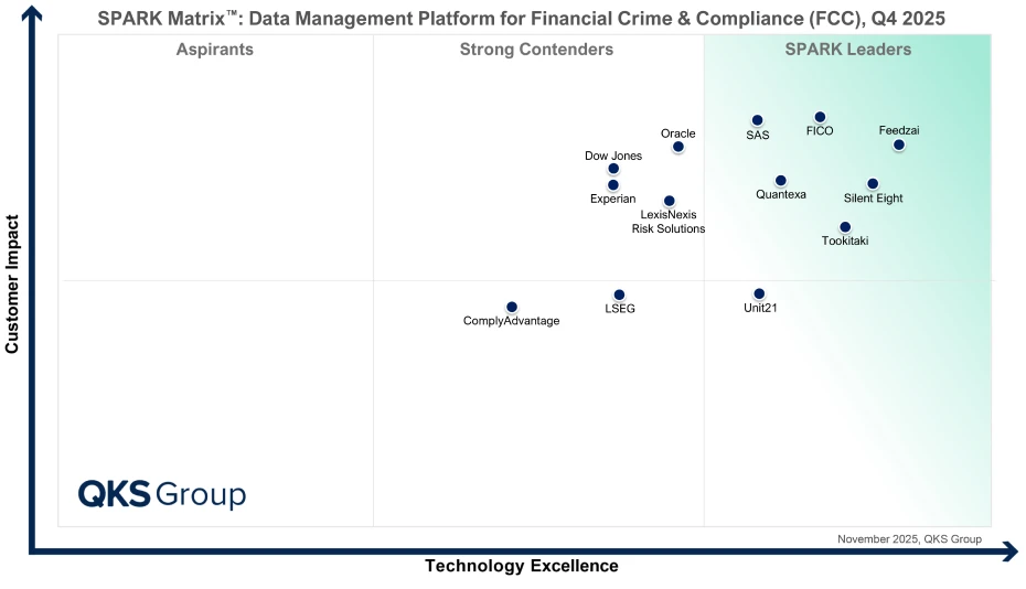 The SPARK Matrix™: Data Management Platform for Financial Crime & Compliance (FCC), Q4 2025 report breaks down how Feedzai’s RiskOps solution helps us stand out as a Leader in the market by operationalizing risk intelligence in real time across onboarding, payments, and workflow monitoring. Learn how our platform:
